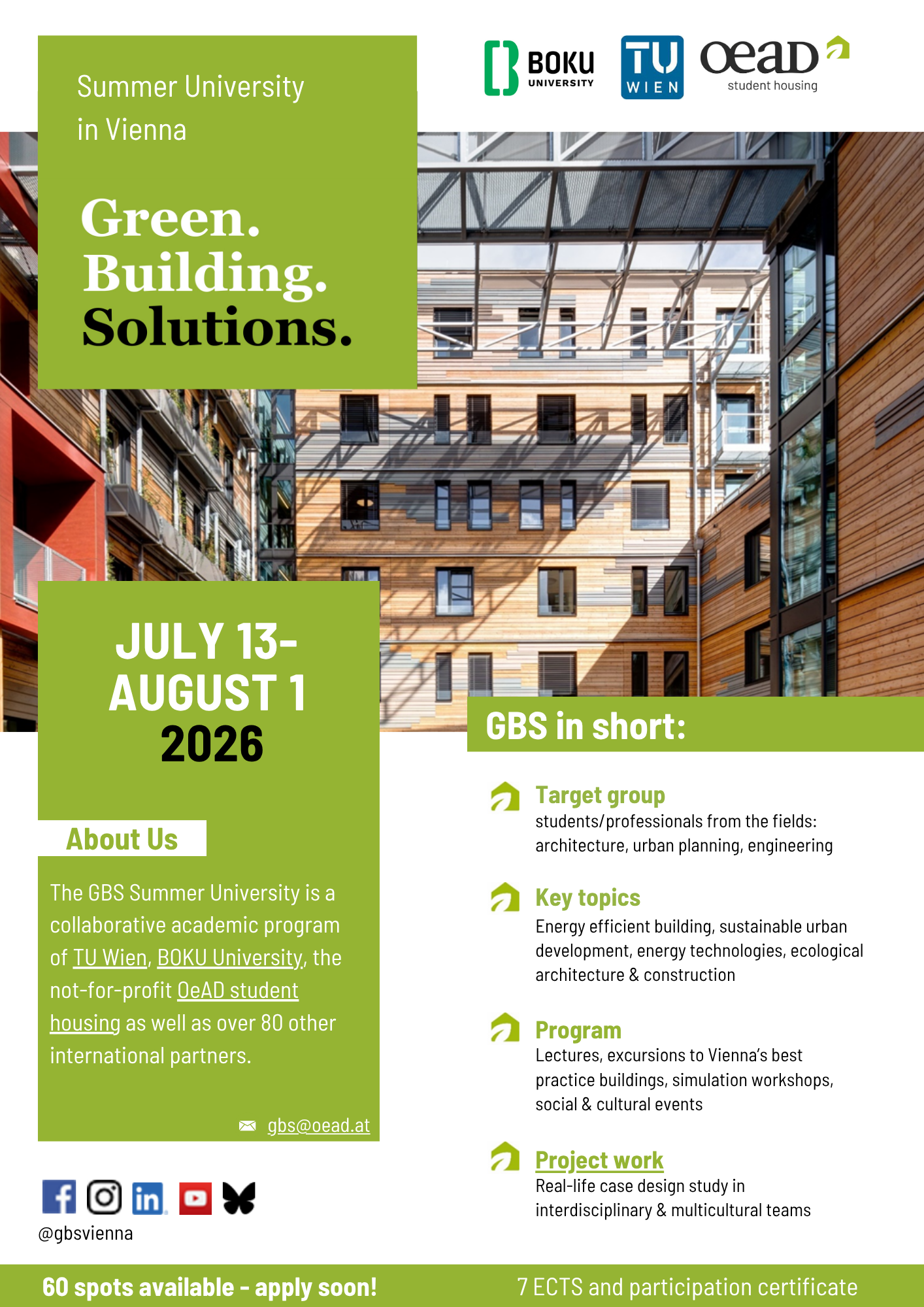 GBS provides master-level, interdisciplinary education that empowers participants with the skills to drive sustainable change in the building and urban planning sectors. The academic program offers both theoretical knowledge and hands-on experience, enabling participants to apply their learning to real-world challenges. Learn how to integrate ecological, technical, and economic solutions to build a sustainable future.